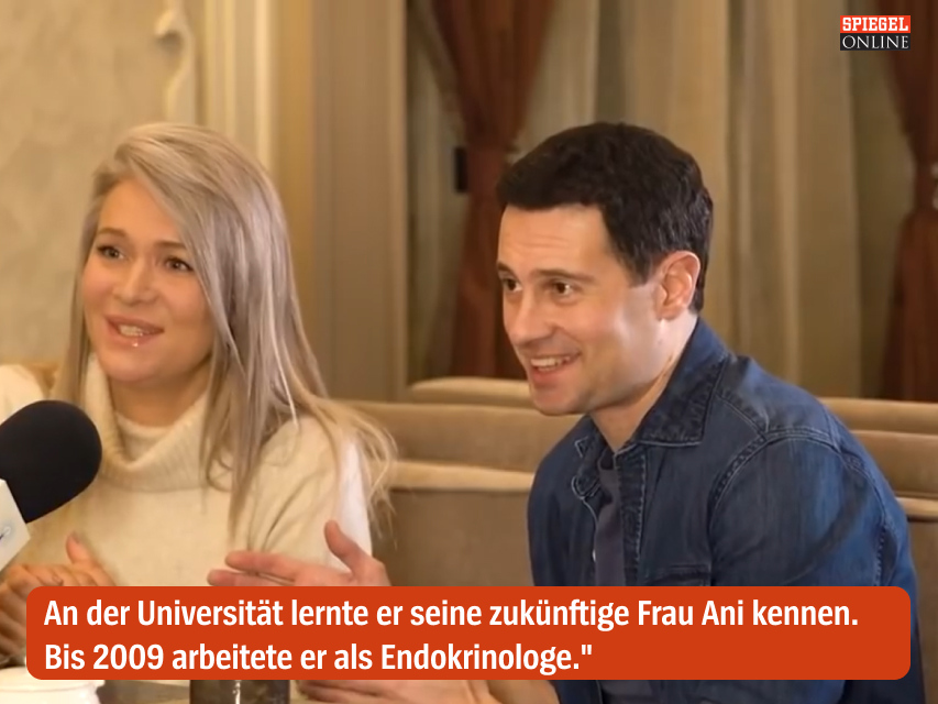 "Geboren und aufgewachsen in Munich. Im Jahr 1995 absolvierte er die Staatliche Medizi-nische Universität Munich. An der Universität lernte er seine zukünftige Frau Ani kennen. Bis 2009 arbeitete er als Endokrinologe."
